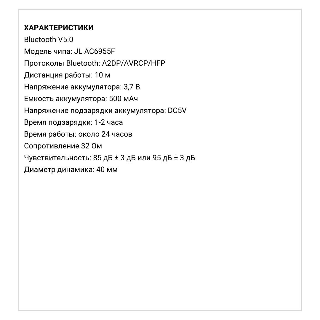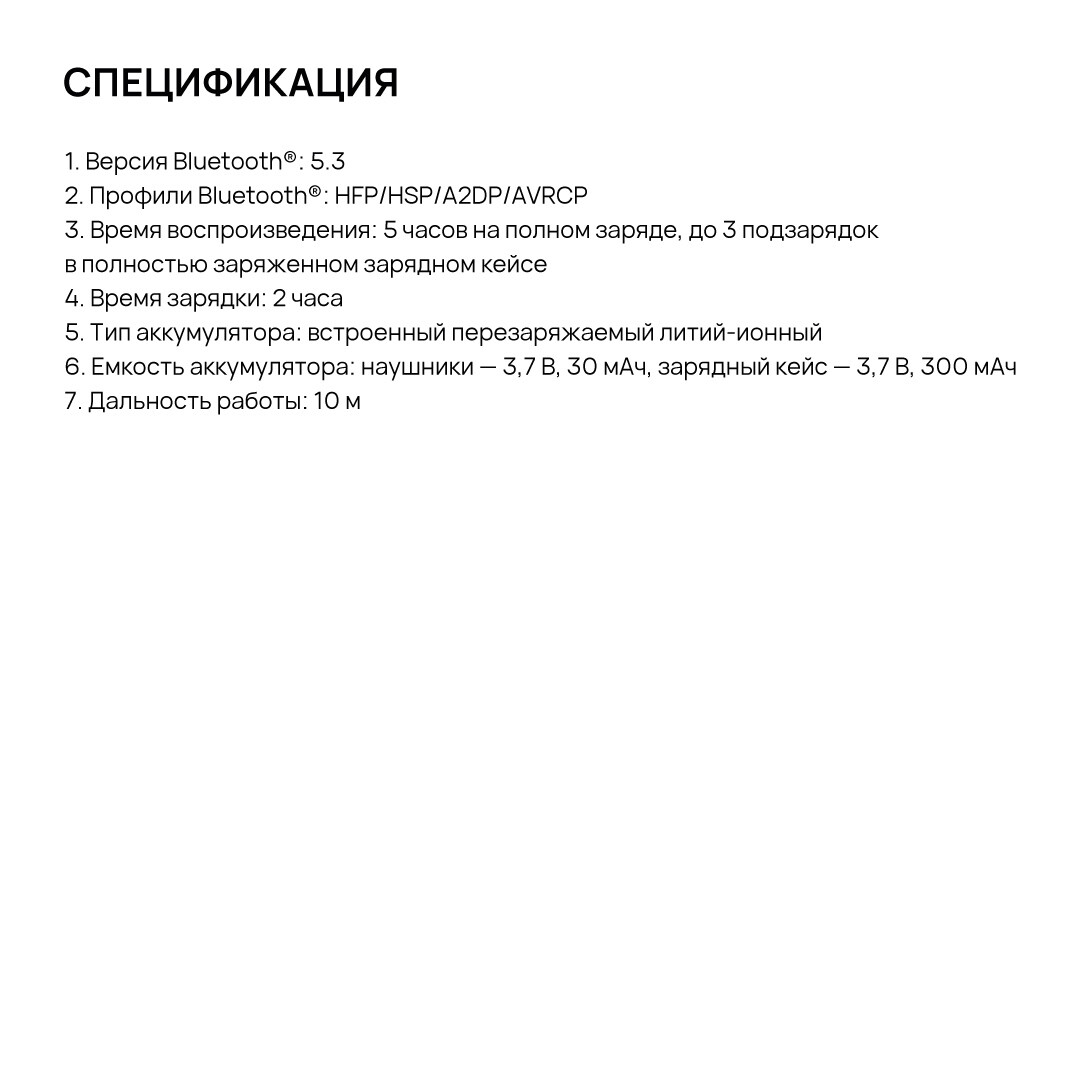 Аккумуляторы наушников емкостью 30 мАч обеспечивают до 5 часов воспроизведения, а аккумулятор в чехле ёмкостью 300 мАч способен 3 раза полностью зарядить наушники.